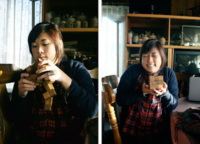 Vy kept herself entertained trying to figure out this crazy wood cube puzzle.
